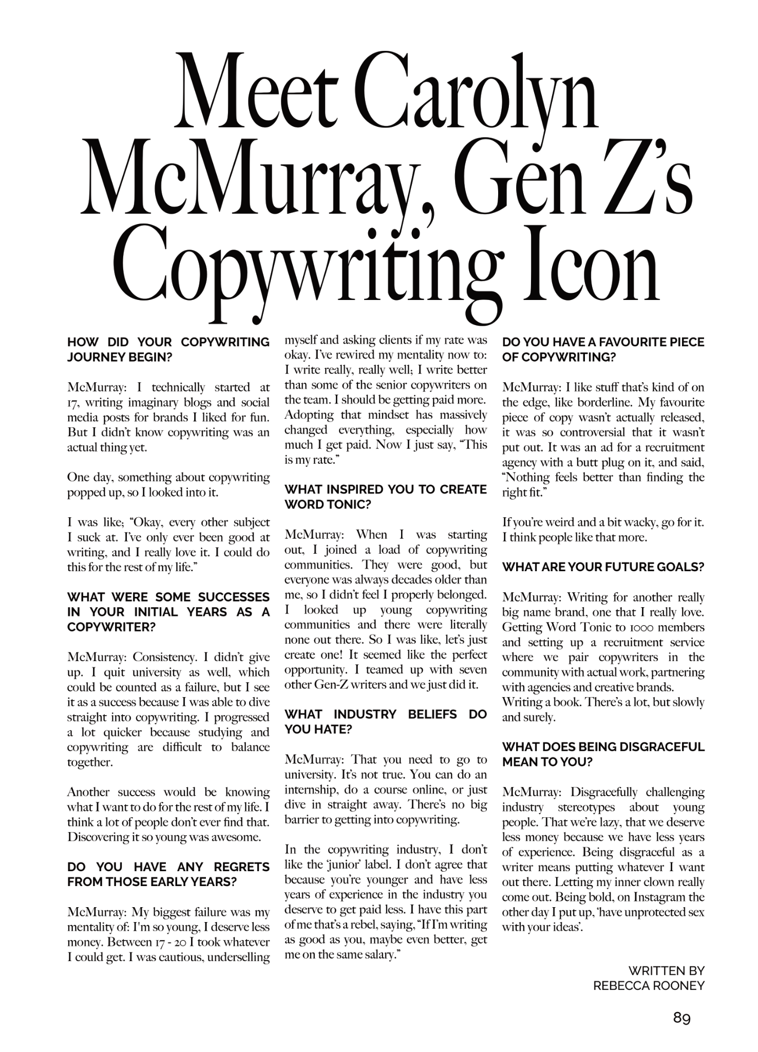 ← Back Published on 31st July 2023 Meet Carolyn McMurray, Gen Z's Copywriting Icon Published in Issue 12 of Disgraceful Magazine.